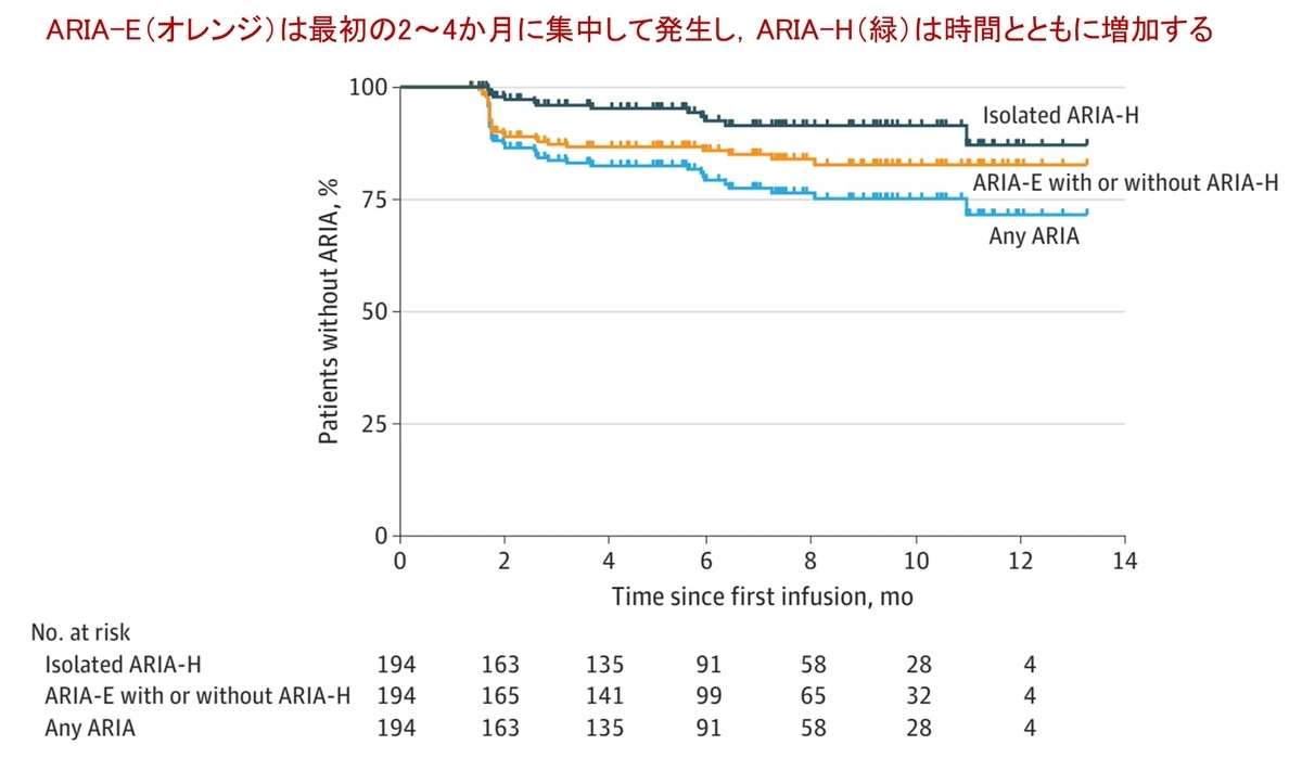 この研究でもっとも印象的だったのは図1で,ARIAが時間経過とともにどのように出現するのか視覚的に分かります.治療開始後,ARIA-E(浮腫;オレンジ)は早期(最初の2〜4か月)に集中して発生し,その後の出現頻度は低下します.一方,ARIA-H(微小出血など;緑)のみを呈する症例は時間とともに徐々に増加していく様子が明らかになりました.つまりすでに周知されているように,開始初期のMRIモニタリングは重要ですが,ARIA-Hは治療期間を通して注意する必要があると言えます.