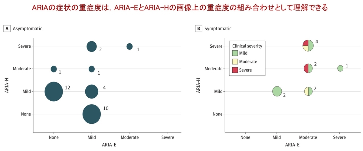 また図2も重要です.ARIA-EとARIA-Hの画像上の重症度を縦軸と横軸に取り,それらの組み合わせにおいて,患者が症候性であったか無症候性であったかを可視化しています.無症候性ARIA(図2A)の多くは,軽度〜中等度のARIA-Eと軽度のARIA-Hにとどまりました.一方,症候性ARIAはすべてARIA-EとARIA-Hの両方を有しており,とくに症状が重篤である症例(赤)では,中等度以上のARIA-Eと中等度以上のARIA-Hの組み合わせで認めることが分かりました.