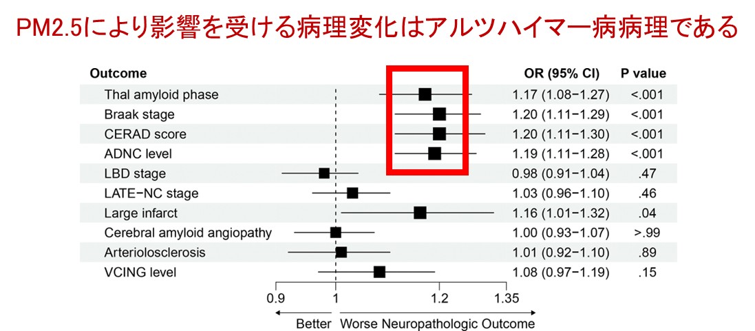 解析の結果,PM2.5曝露が1㎥あたり1μg増加するごとにAD神経病理変化(アミロイド斑・タウ神経原線維変化)のオッズ比は1.19(95%CI 1.11–1.28)と上昇し,臨床的にもCDR-SBスコアが平均0.48ポイント悪化していました.
