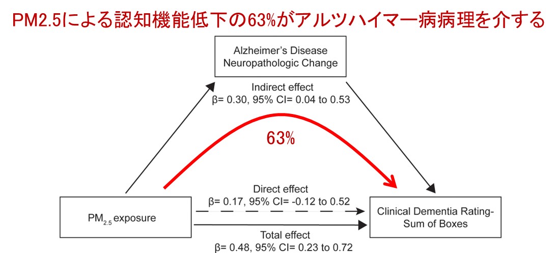 図2の媒介分析では,左に「PM2.5曝露」,中央に「アルツハイマー病神経病理変化(ADNC)」,右に「CDR-SBスコア(認知症重症度)」が並び,矢印で結ばれています.矢印のそばに書かれたβ値が各経路の効果を示しており,左→中央→右の間接効果β=0.30と総効果β=0.48の比率が約63%になるため,「PM2.5曝露とCDR-SBスコアの関連の63%がADNCを介して媒介されていることになります.つまりPM2.5曝露はAD病理を進行させ,その結果として認知症の重症度に影響していることが統計的に裏付けられたといえます.